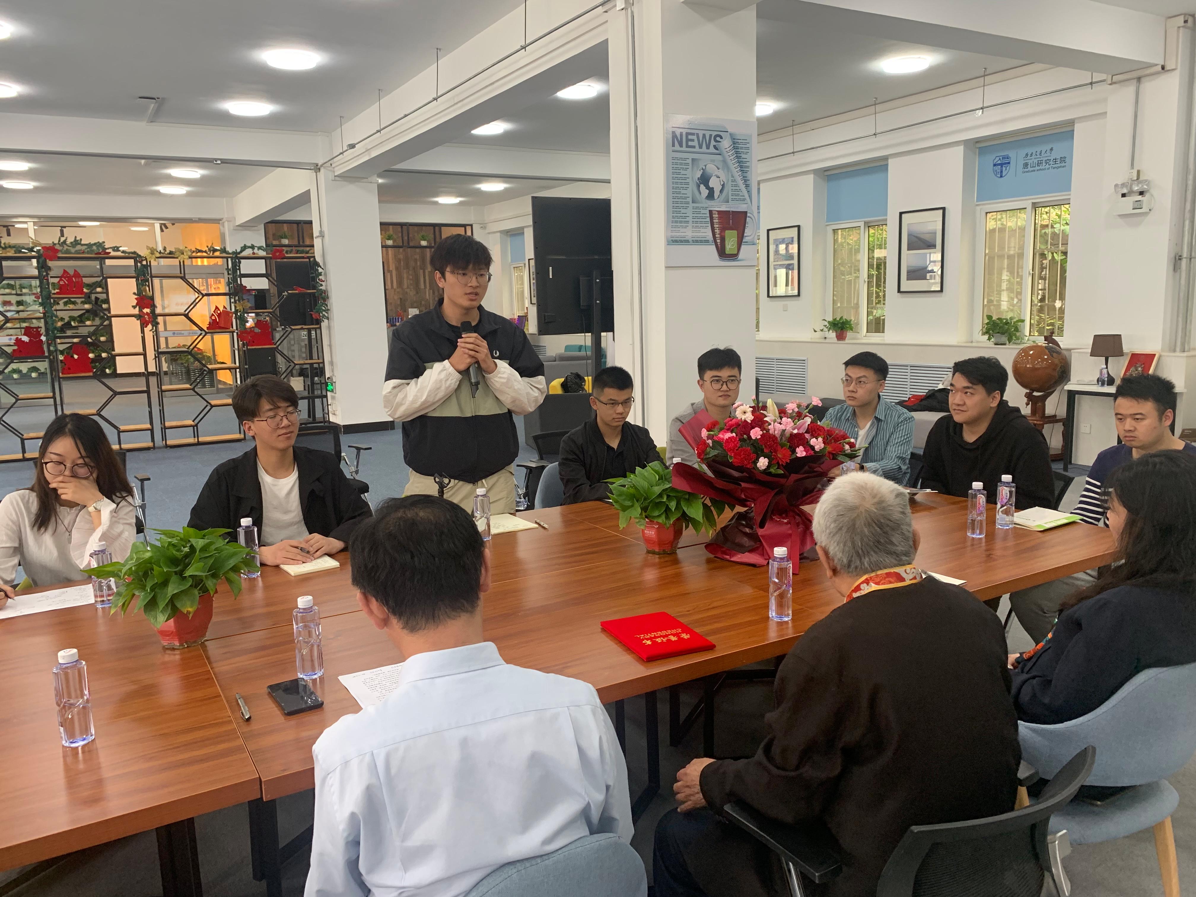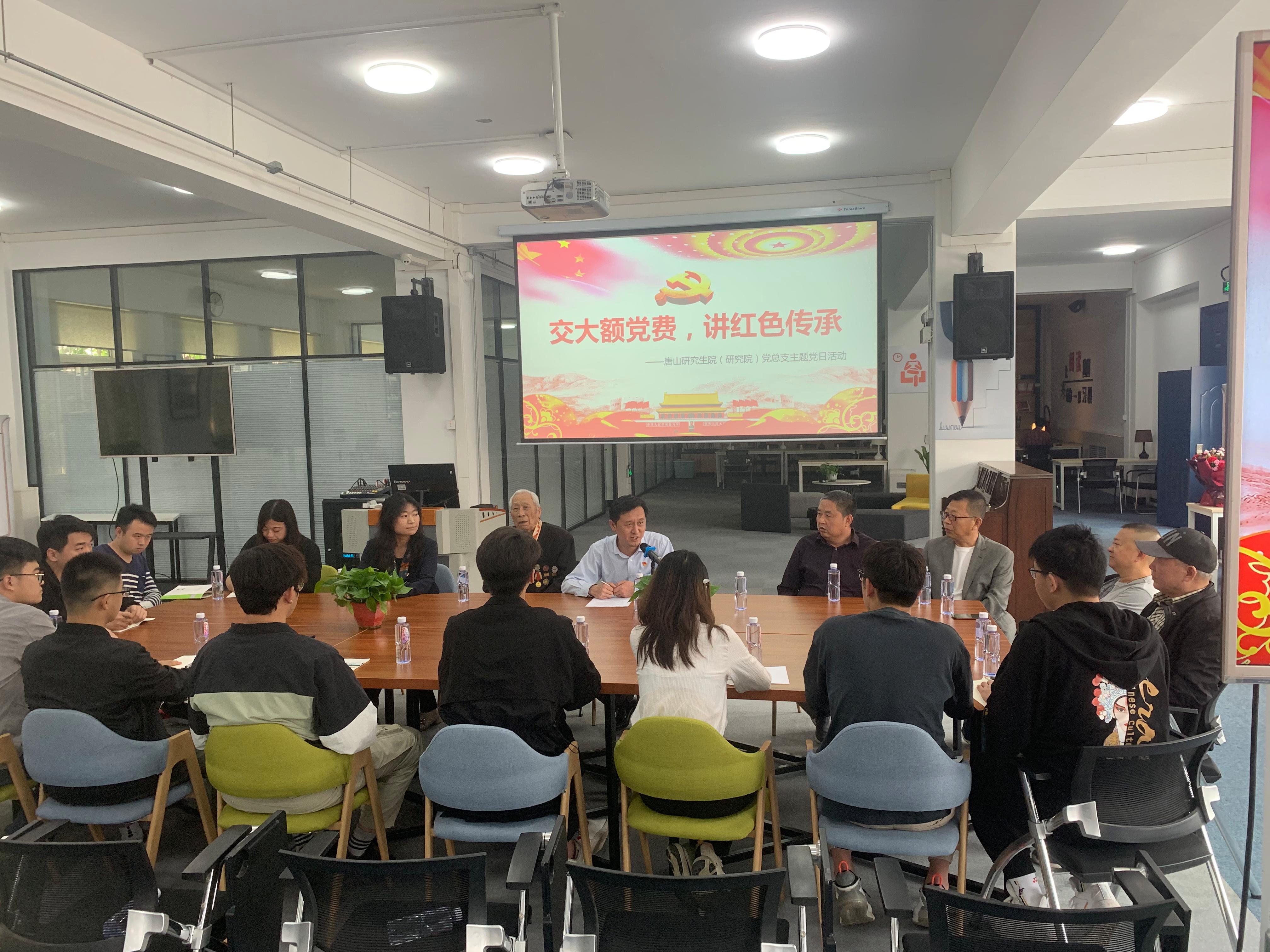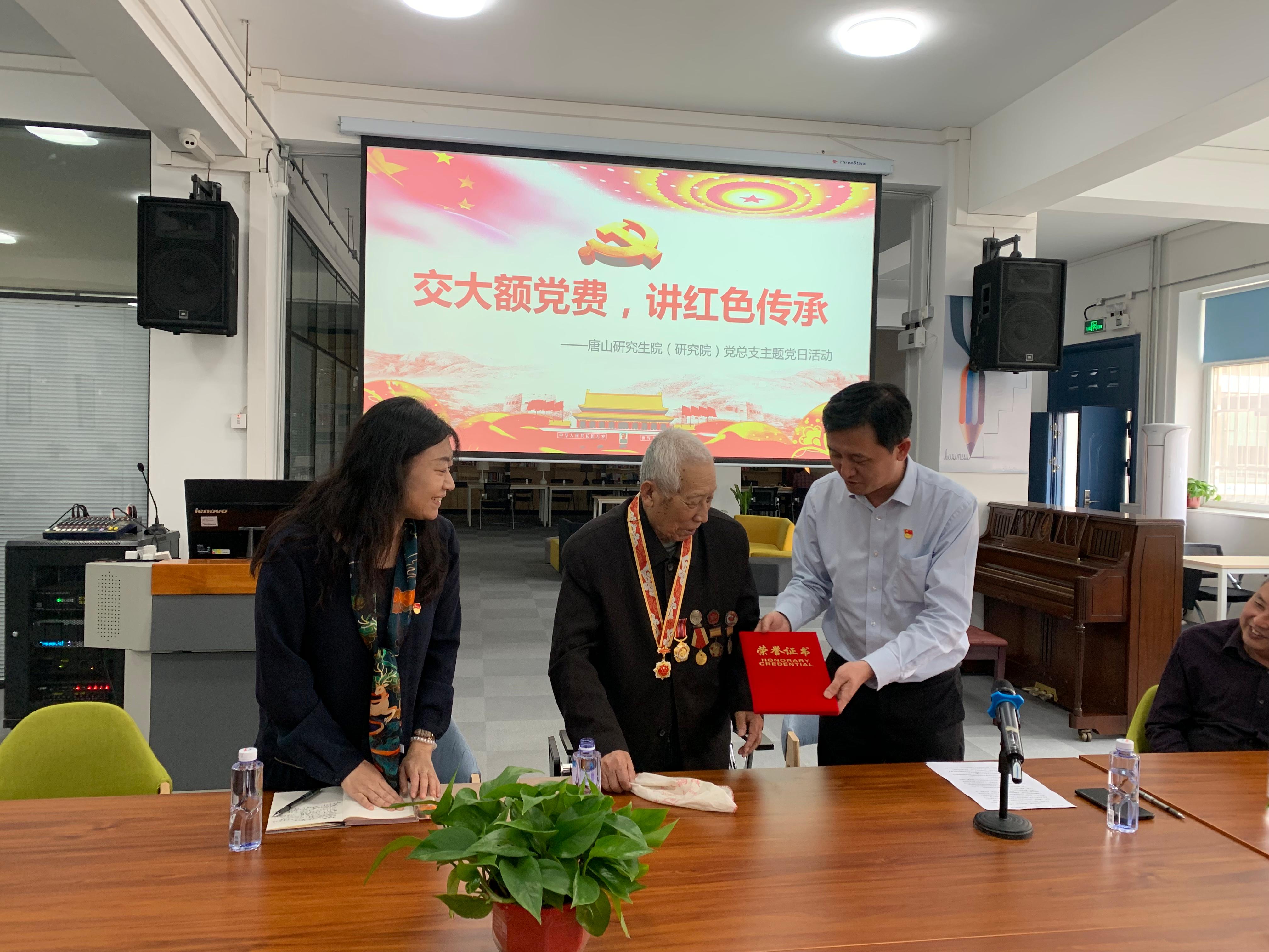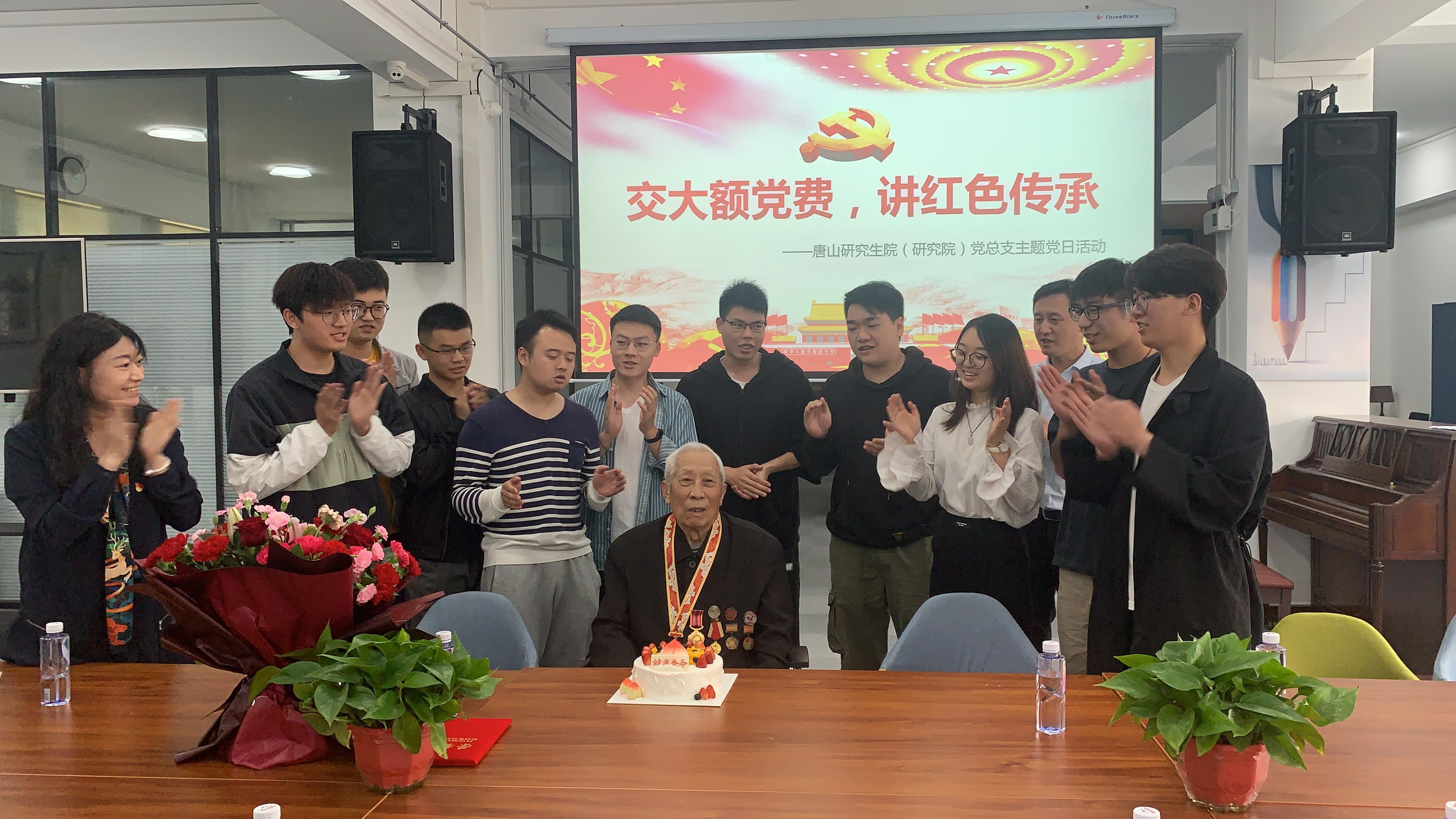 5月13日下午,唐山研究生院(研究院)党总支举办了一次特别的主题党日活动:耄耋党员张恩臣老师为党庆生,向党组织交上了一笔特殊的党费。唐山研究生院(研究院)师生党员代表参加此次活动。