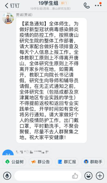 唐山研究生院(研究院)积极通过微信群和钉钉系统向全院师生和离退教职工进行防疫工作宣传,做好在线交流工作,增强师生战胜疫情的信心,提高师生自身防范能力,做到“早发现、早报告、早隔离、早治疗”。各级重要通知均发送到师生本人,确保本人知晓。