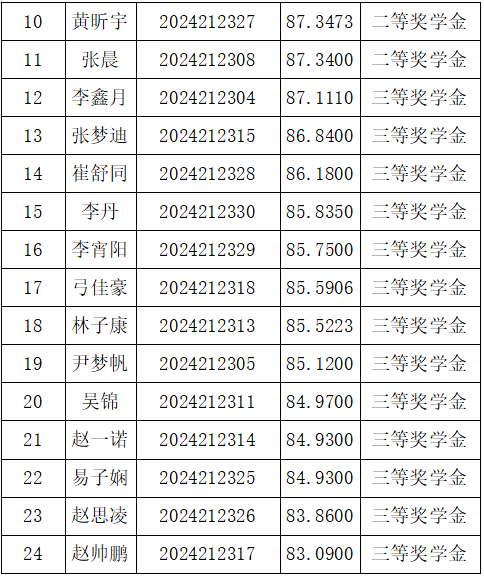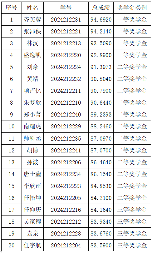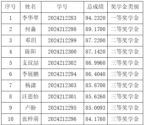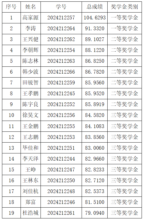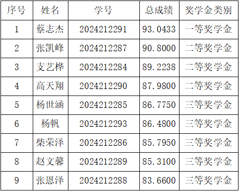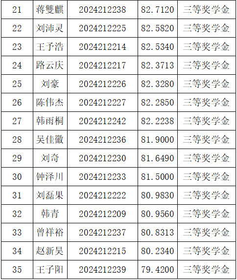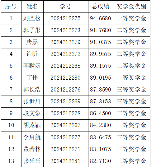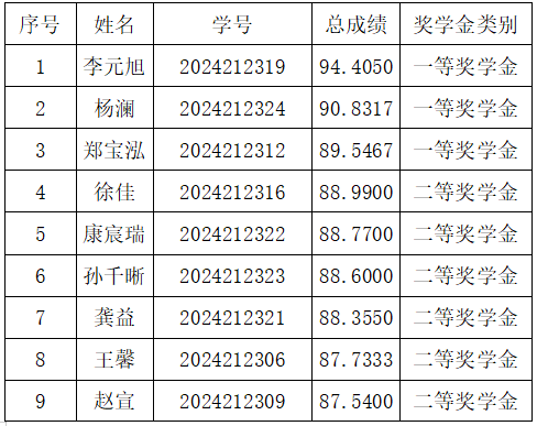 研究生奖(助)学金评定办法(修订)》,按综合成绩排名确定最终获奖类别(综合成绩=第一学年课程平均成绩+学业成果成绩+思想道德素质评价成绩),现将2024级2024-2025学年研究生学业奖学金获奖名单公示如下: