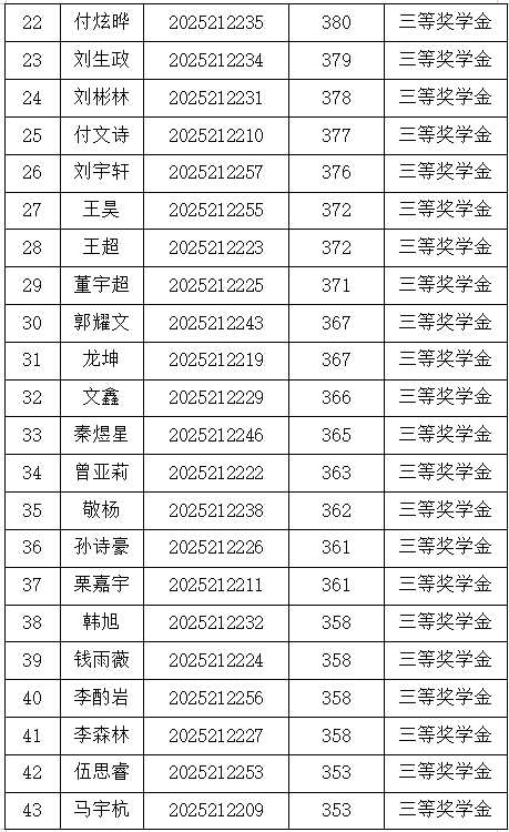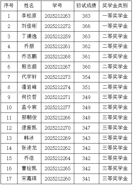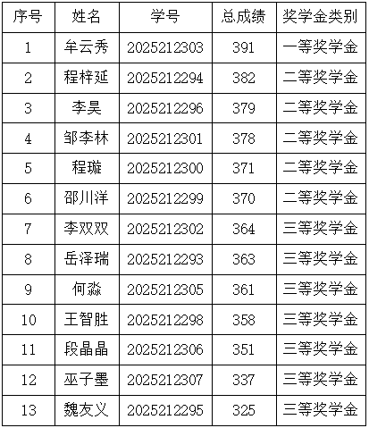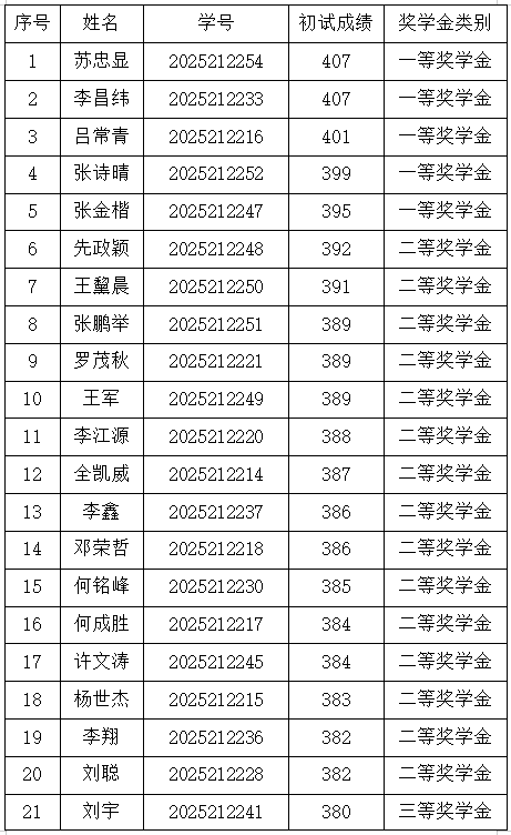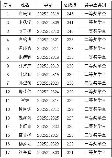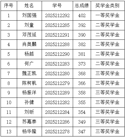 研究生奖(助)学金评定办法(修订)》,研究生一年级奖学金(即新生入学奖学金)评定综合总成绩计分标准为研究生参加全国研究生入学统一考试的笔试总成绩,如出现总成绩相同,物流工程与管理专业以管理类综合能力成绩排名为准,其他专业以思想政治、英语及数学科目总成绩排名为准。经奖助工作委员会评审,现将2025级新生学业奖学金获奖名单公示如下: