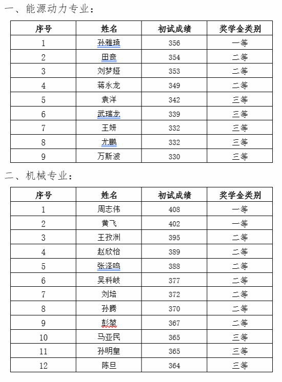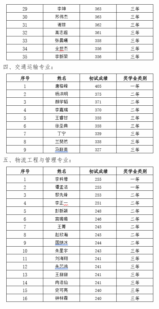 研究生一年级奖学金(即新生入学奖学金)评定综合总成绩计分标准为研究生参加全国研究生入学统一考试的笔试总成绩,如出现总成绩相同,物流工程与管理专业以管理类综合能力成绩排名为准,其他专业以思想政治、英语及数学科目总成绩排名为准。经研究生奖助工作委员会评审,现将2023级新生学业奖学金获奖名单公示如下: